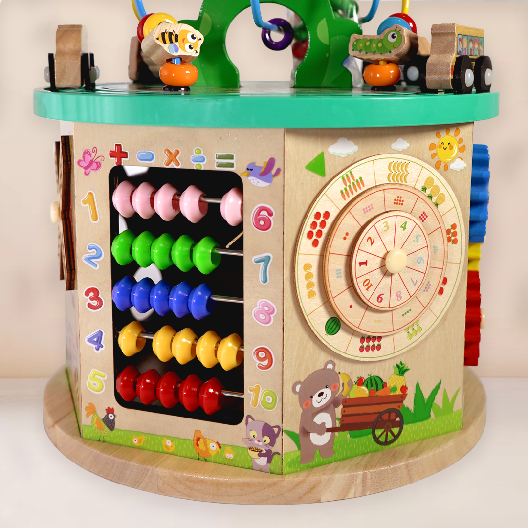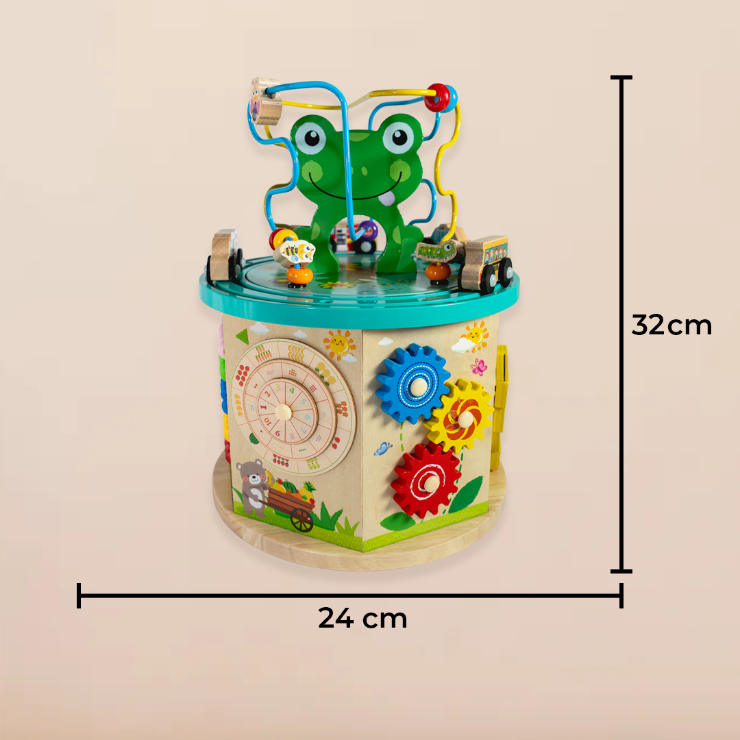 El Seven Sides Activity Cube es un centro de exploración con siete lados llenos de juegos educativos: laberintos de cuentas, figuras deslizantes, engranajes, puertas, y un colorido diseño de ranita que invita a descubrir. Cada lado estimula una habilidad diferente, ayudando a los niños a aprender jugando.