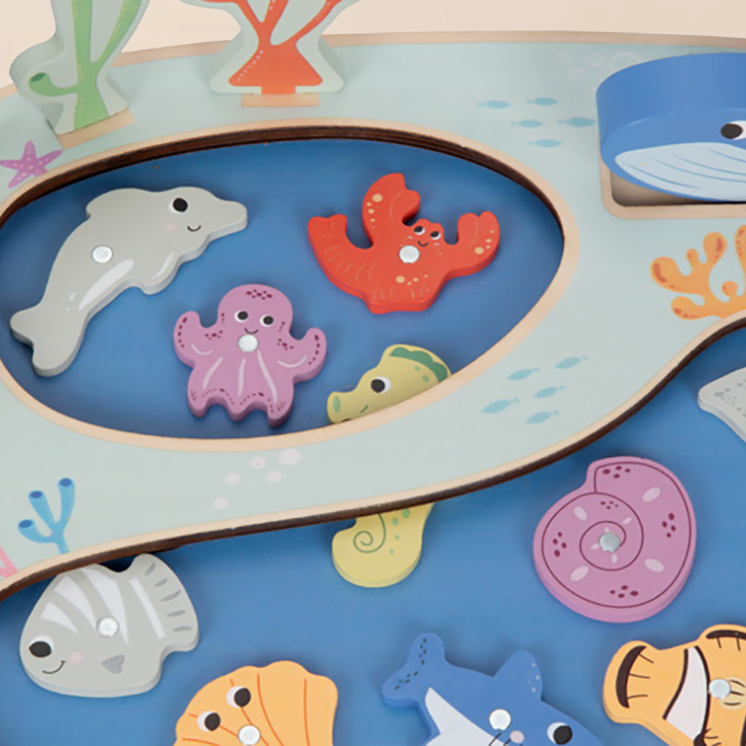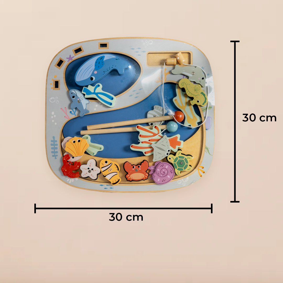 Convierte el aprendizaje en una aventura marina llena de color y concentración. Cada pez tiene un pequeño imán que permite atraparlo con las cañas incluidas, ayudando al niño a desarrollar la coordinación mano-ojo, la paciencia y la motricidad fina.