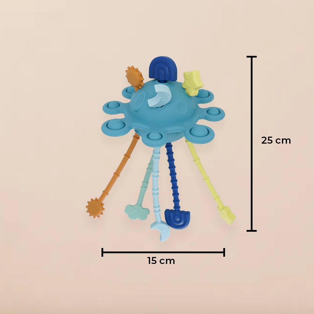 Este juguete sensorial es ideal para estimular la motricidad fina, la exploración táctil y la coordinación ojo-mano. hecho de silicón flexible con texturas que invitan a tu bebe a jalar, empujar y manipular.