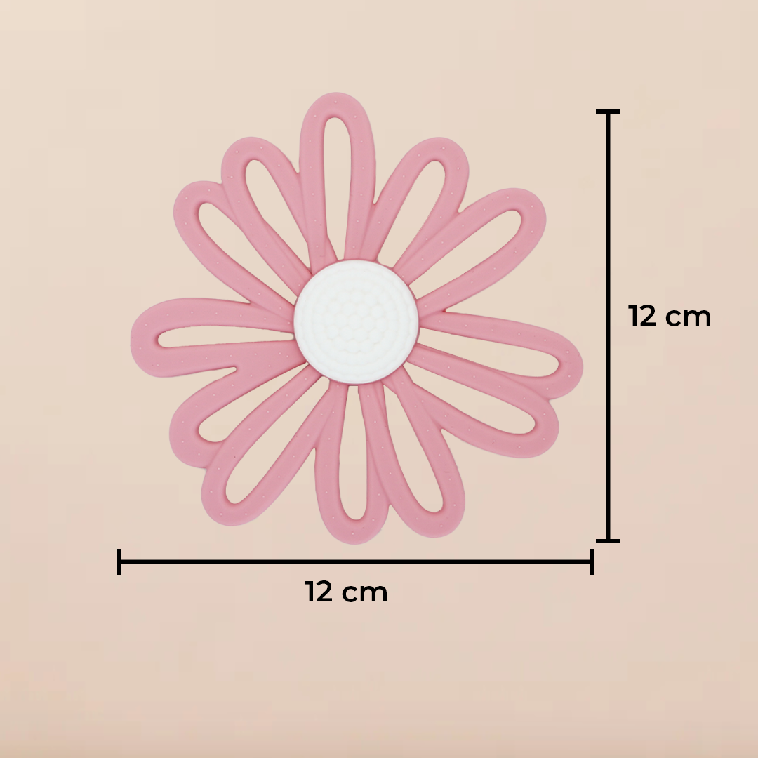 Mordedera con diseño de flor en silicón suave y flexible, su estructura abierta permite un facil agarre y diferente formas de exploración táctil, sus pétalos alargados con textura en el centro ayudan a masajear las encias, promoviendo el desarrollo sensorial y motor desde los primeros meses.