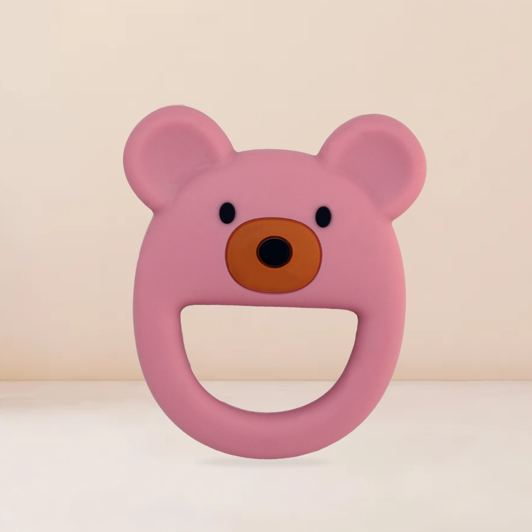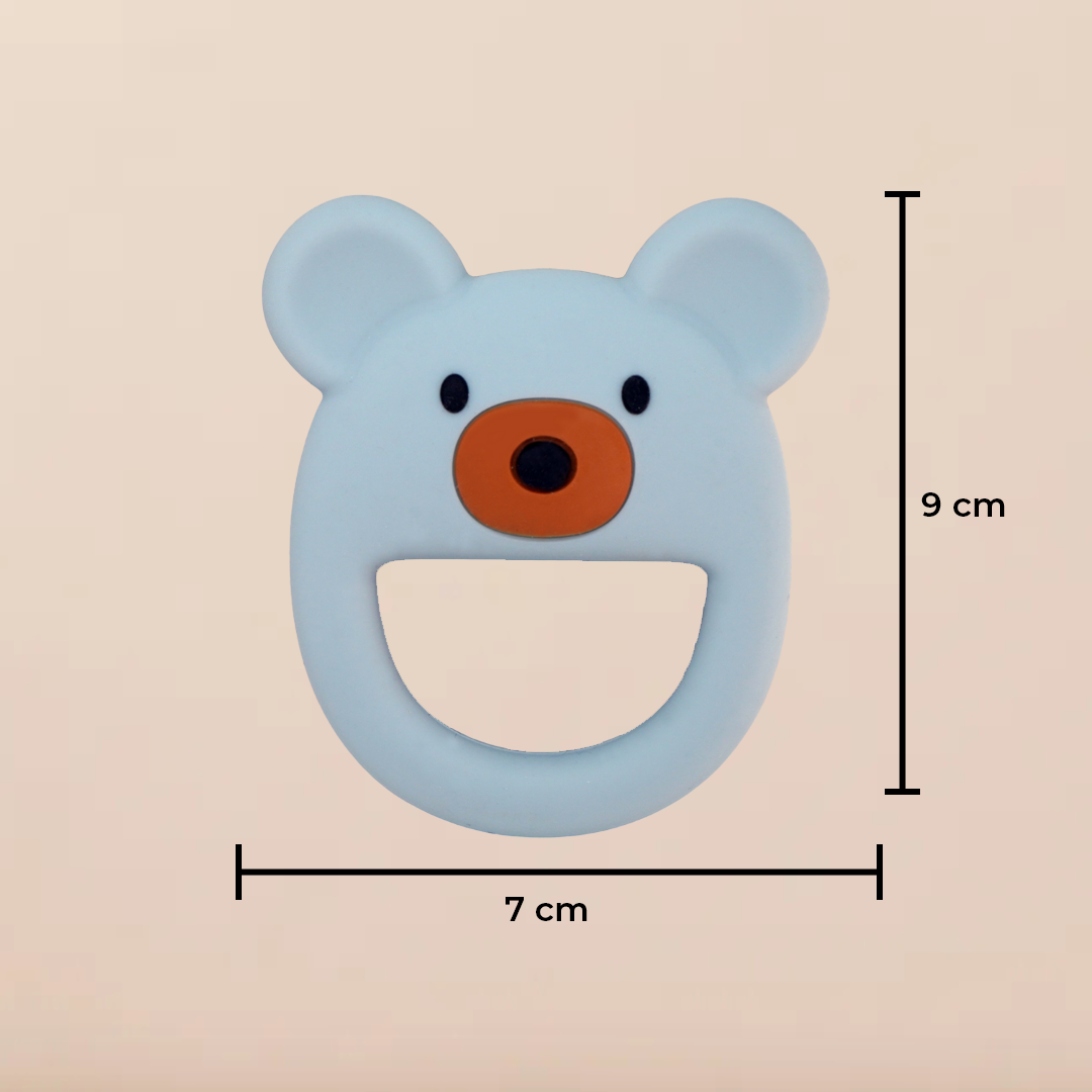 Esta mordedera es una opción minimalista y encantadora para acompañar la denticion de tu bebe. Su diseño plano con forma de carita de oso facilita el agarre, mientras su silicón suave ayuda a calmar el malestar de las encias.