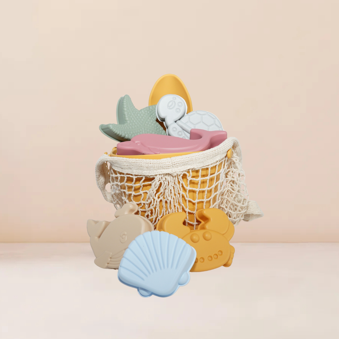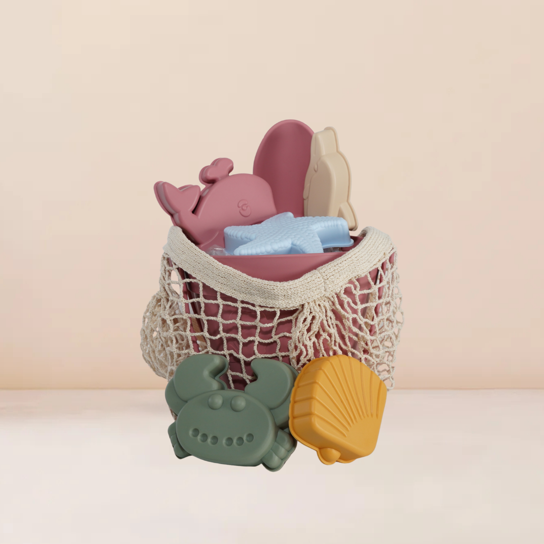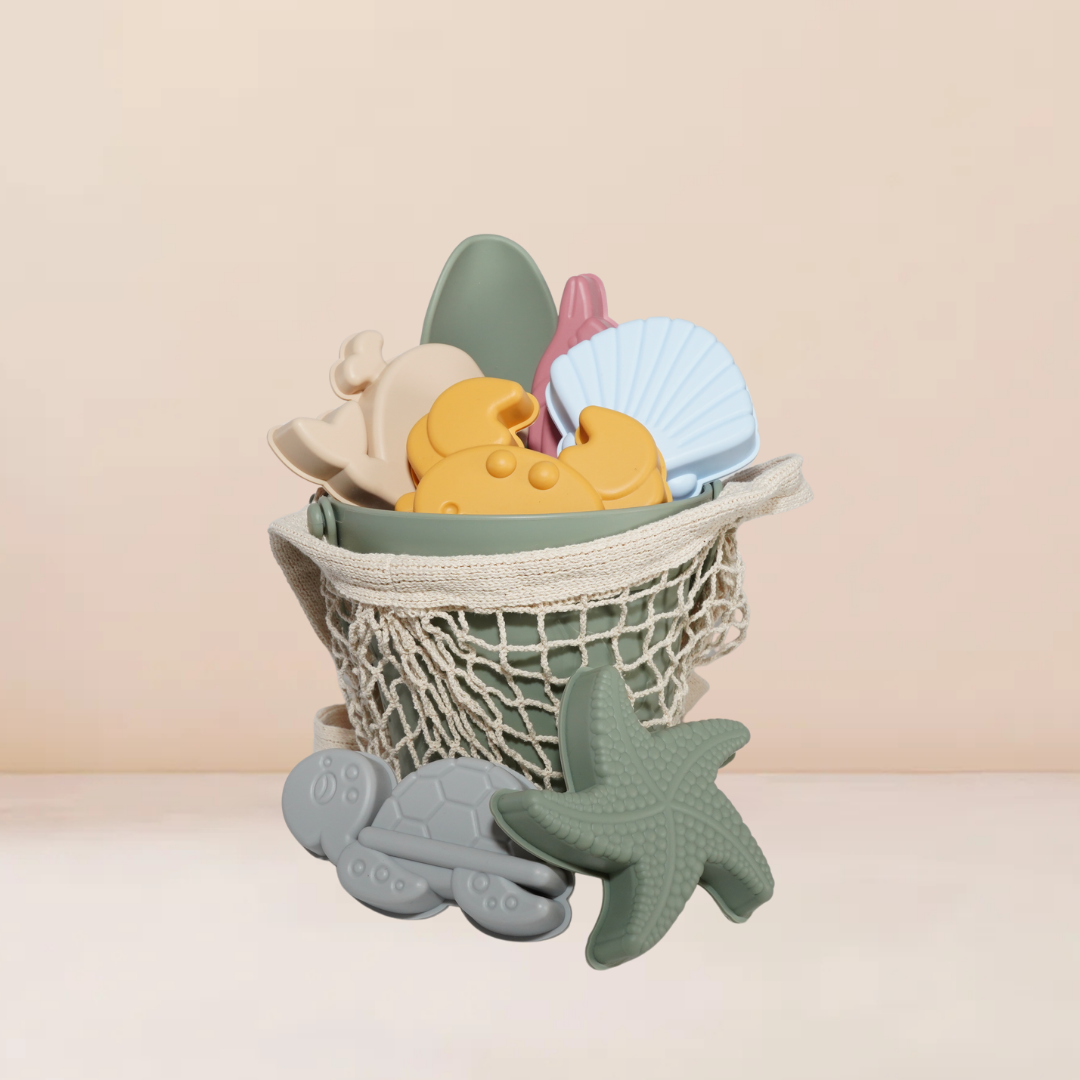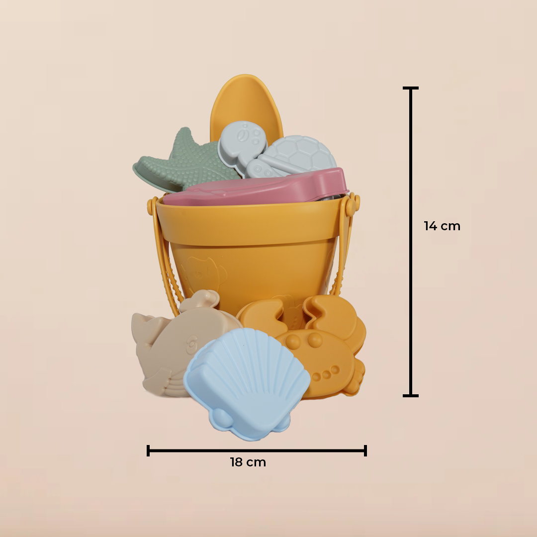 Este set de playa es el compañero perfecto para días de sol, en la arena o en el baño. Hecho con componentes de silicón suave y flexible, este set incluye balde, pala y moldes con figuras marinas seguros para tu bebe. Diseñados para estimular el juego libre, la creatividad y la motricidad es ideal para horas de diversión de tu pequeño.