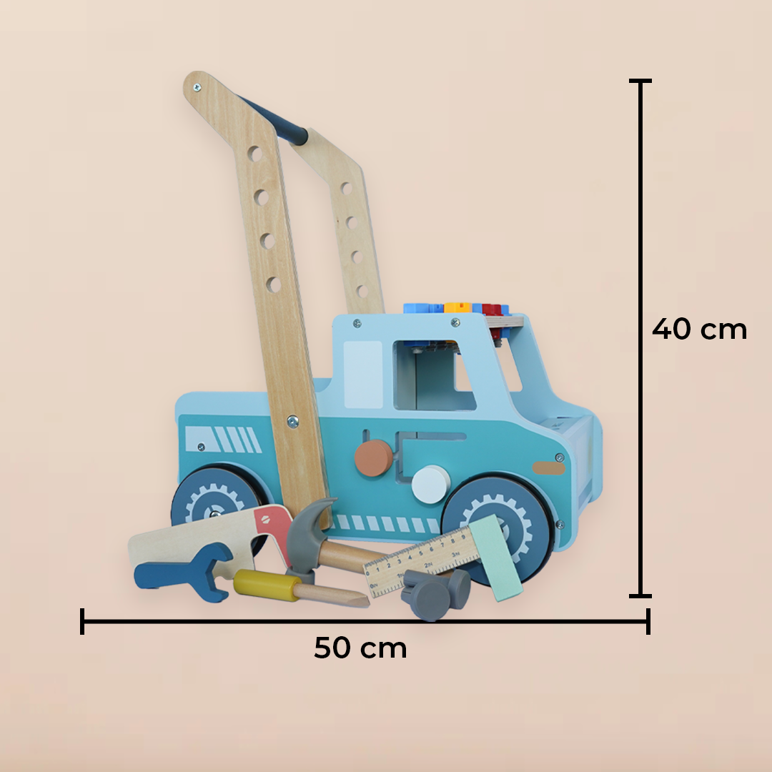 Fabricado en madera natural con detalles de colores suaves, incluye herramientas, engranajes, tornillos y piezas para armar y desarmar, estimulando la coordinación y la lógica mientras juegan a ser pequeños constructores.